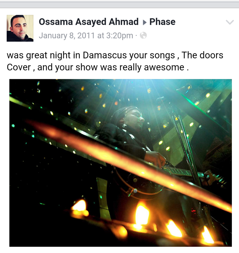 Rocking the Middle East Not so long before a pleasant surprise for the rock audience in Syria came to the surface. Namely, the rock trio of Greece’s Phase performed their proximately 2 hrs. set on the stage of Zodiac Pub in old Damascus. The event attracted attention instantly within the circles of rock culture, as it gathered its importance on its own since Syria is not blessed with hosting international acts really often, let alone an independent rock one. As a matter of fact, it’s the first visit of an international rock group after the Gorillaz in July 2010. In the subject matter, Phase helped us travel into a psychedelic, almost religious, rock experience, combining their powerful electrical sounds and trippy atmospheres into the mystic location of old Damascus that added so much to the vibes of the night. The band performed numbers from their album “In Consequence” as well as covers of monumental rock bands like The Doors, that the audience seemed to be far into. The night came about with floating intensity as there were transitions from electric to acoustic and to electric again and the band managed to maintain the enthusiasm in high levels throughout the entire event. Of course, nothing is perfect and some informality couldn’t be absent, like the misfeasance of the timeline leaving the venue without finishing the whole intended set, which of course seemed rather than a petty offence contrasting with the whole pomp of the ceremony. It was an overall stunning evening with great loads of musical excitement that at the very least touched if not moved even the most skeptic listener, and a beautiful marriage of the Middle Eastern and Western cultures. A surprisingly interesting night in conclusion, which ended with the commitment that it would be repeated somewhere in a not-so-distant future.