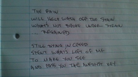 Marios Papakostas, who had been well into the debut album from before he joined, was prompting me to write a song that could match Ibidem in style, against his former stance, being minded for us to avoid having previous songs as blueprints or following formulas, so I guess I subconsciously granted that wish in a way with this song. Amethyst, in a similar manner to Ibidem, features outbreaks for hooks, before the song climaxes to end on a coda (i.e., a totally different musical theme to what was previously heard, usually introduced as an outro) after an instrumental bridge that somewhat releases (but not totally resolves) the tension that is built with the verses.