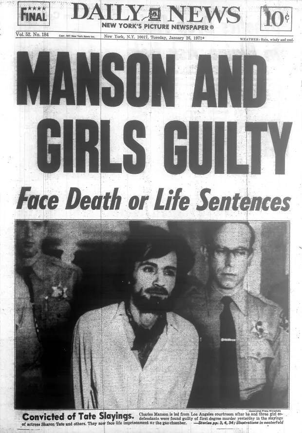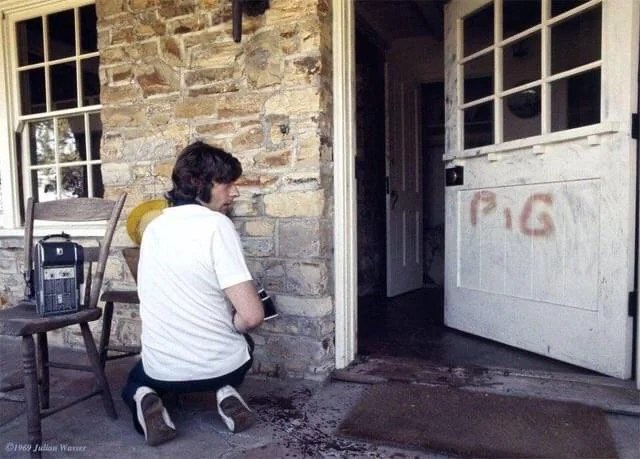 Manson happened to be a frustrated musician who had written a song the Beach Boys recorded (Never Learn not to Love, originally written as Cease to Exist), and enjoyed the respect of colossal artists in the likes of Neil Young. However, as not everyone accepted his ‘grandiosity’, he took offence at a producer who rejected him, and who happened to have lived in a mansion he had sold to film director Roman Polanski. Manson directed his ‘family’ to go to that address and kill everyone as revenge, likely not knowing of the change of ownership, and they subsequently brutally murdered 4 people (to be followed by a further 2), including Polanski‘s then heavily pregnant wife and actress Sharon Tate and went on to write inscriptions with their blood including Helter Skelter (misspelled as ‘Healter Skelter’) and ‘(Death to) Pigs’.